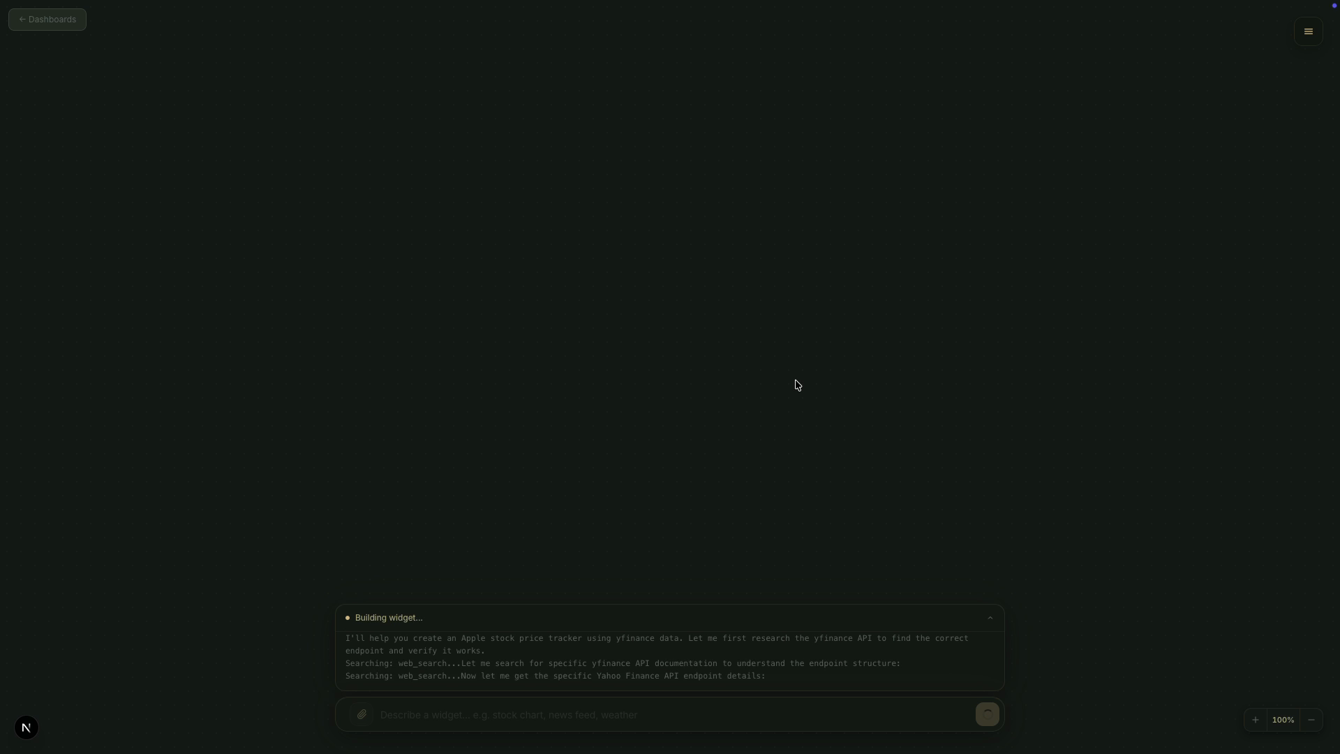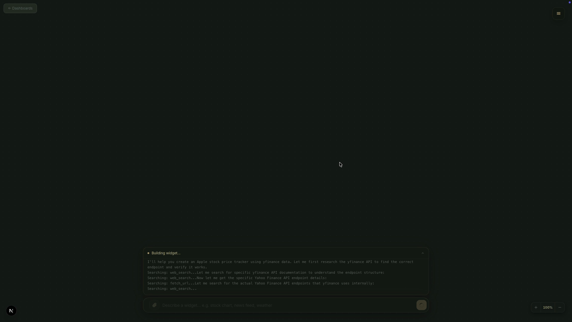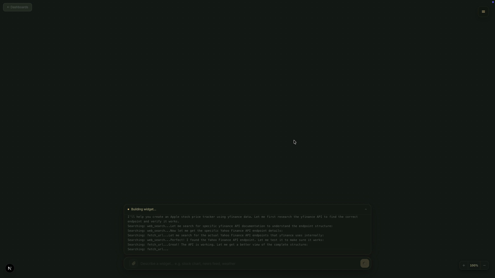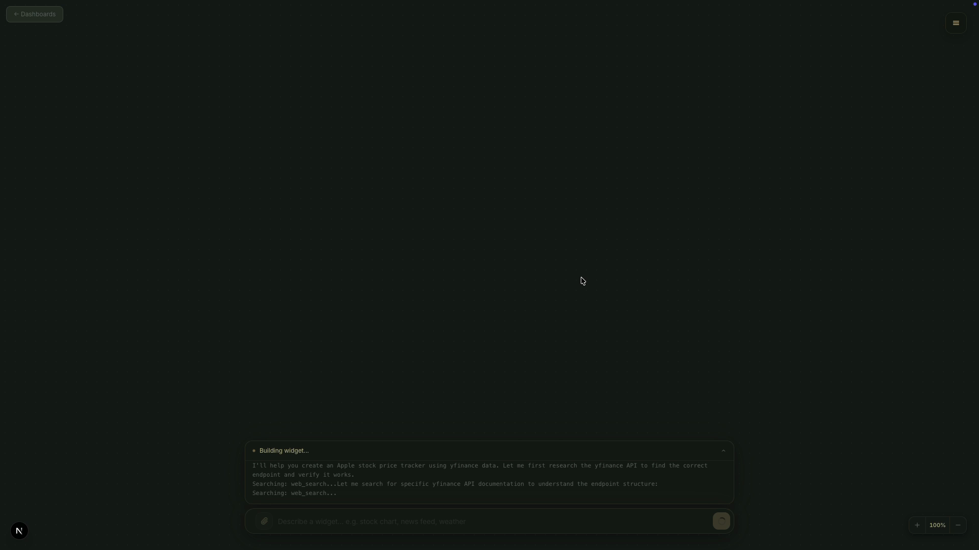 Describe what you need. Get a live, interactive dashboard, powered by AI that researches, builds, and updates in real time.