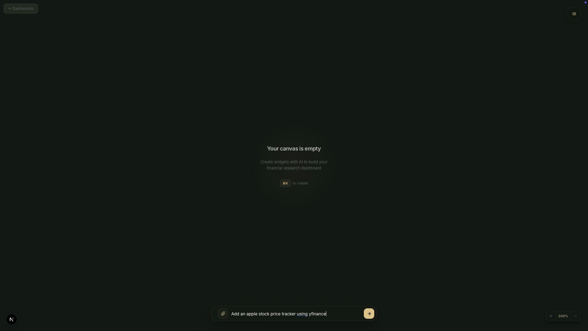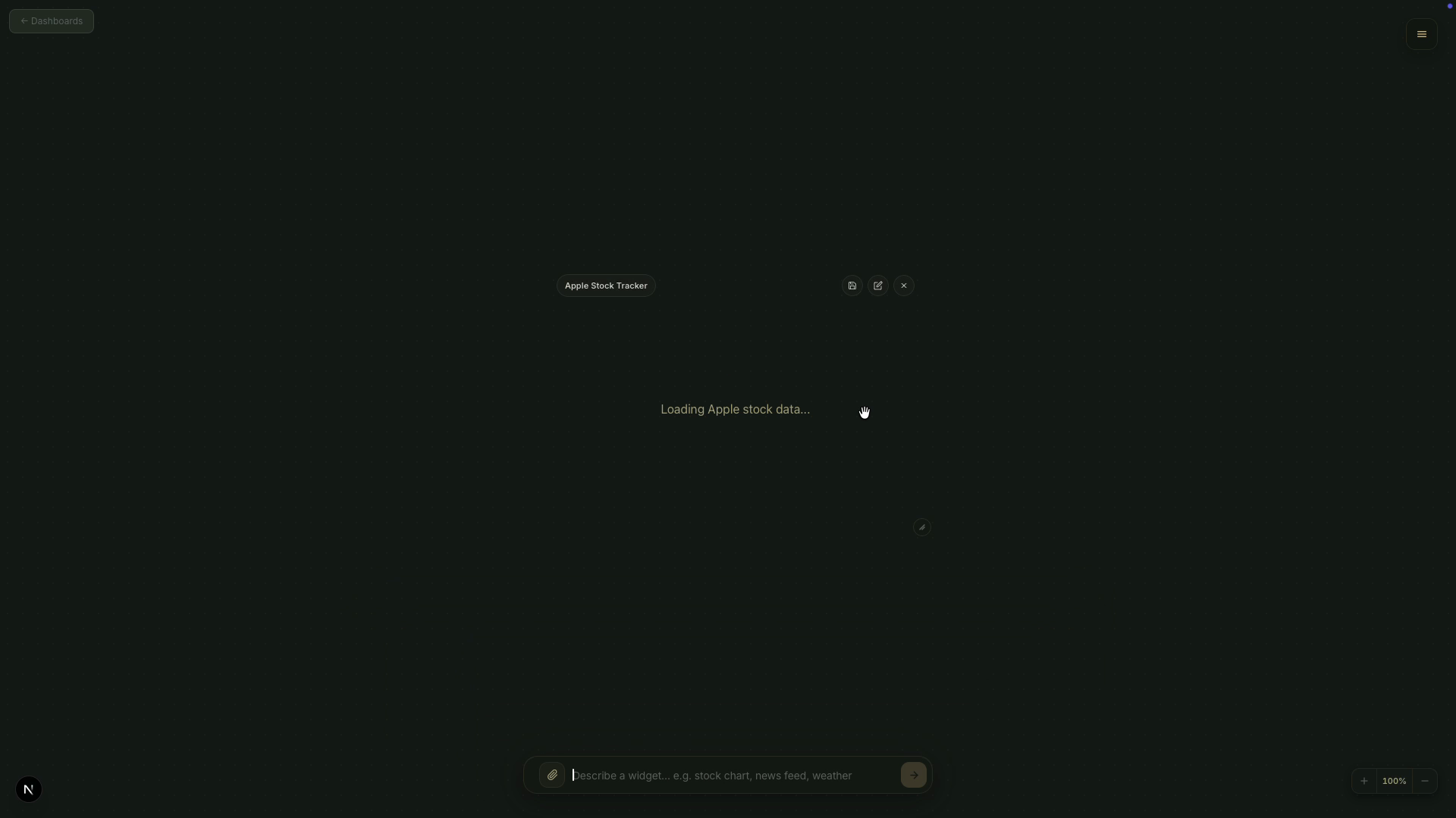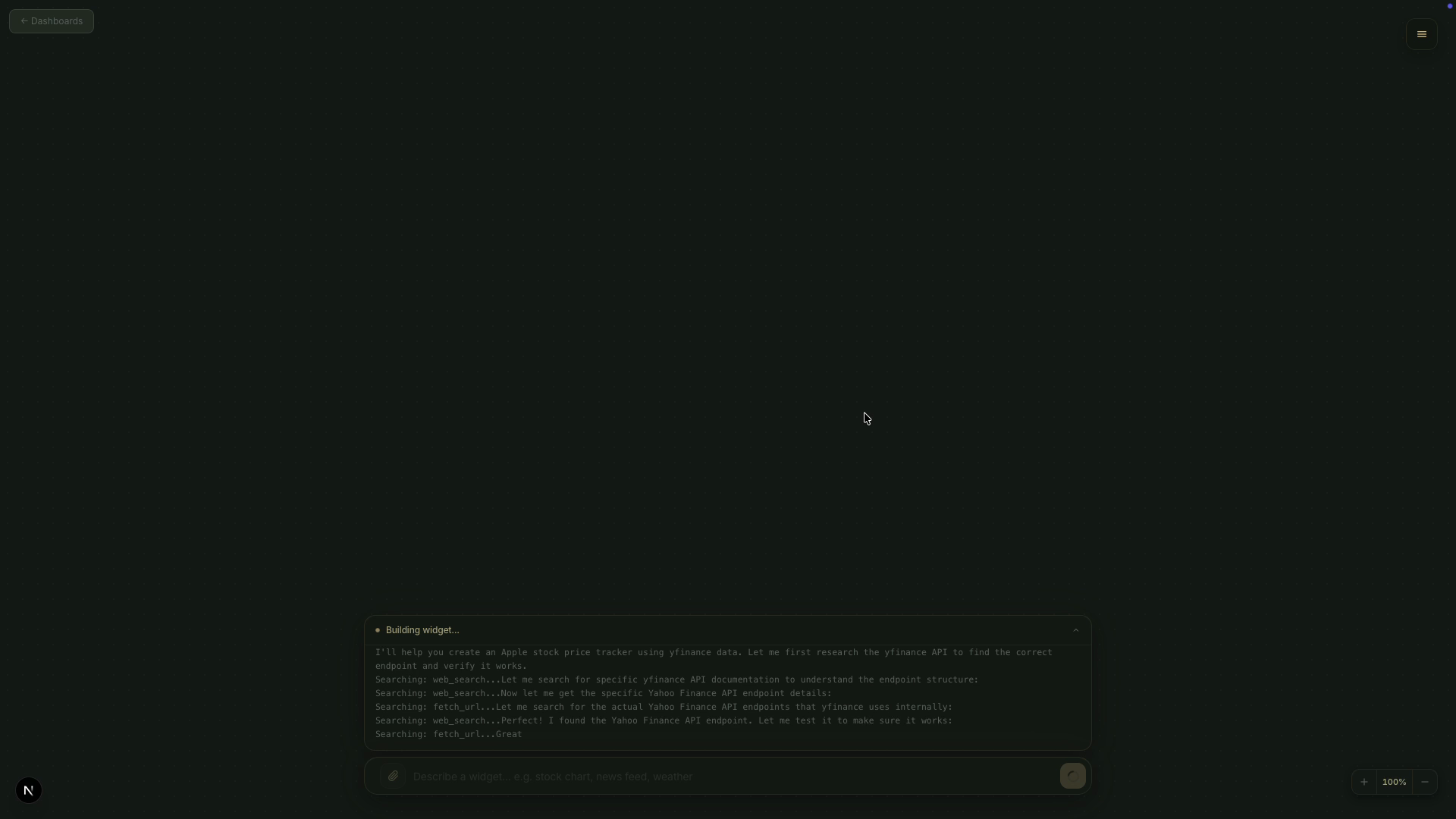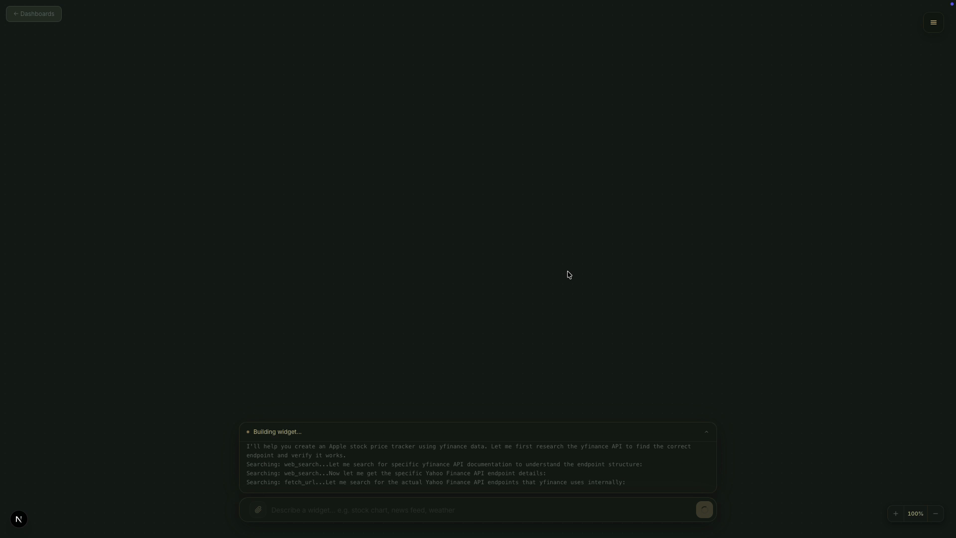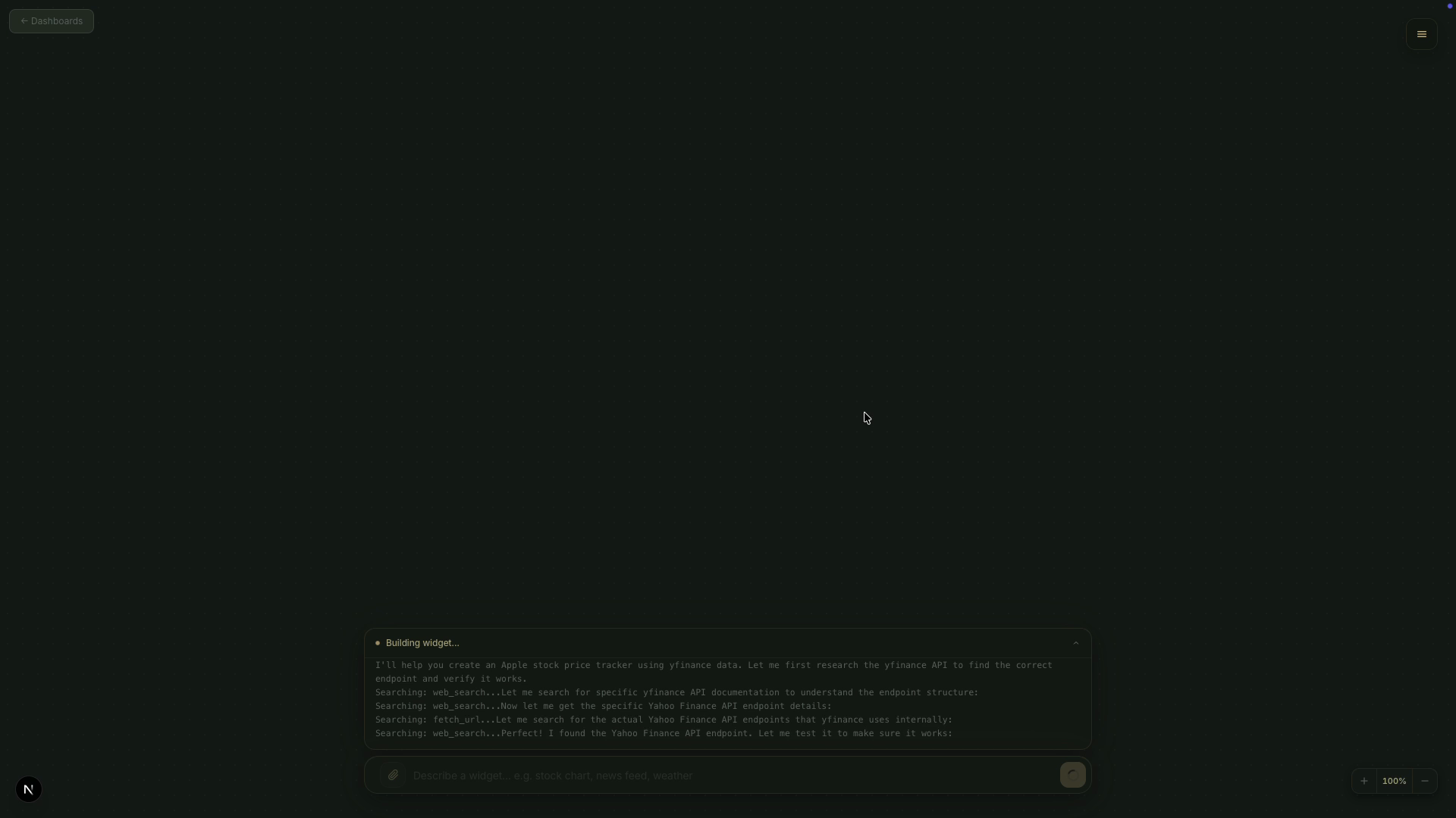 Describe what you need. Get a live, interactive dashboard, powered by AI that researches, builds, and updates in real time.