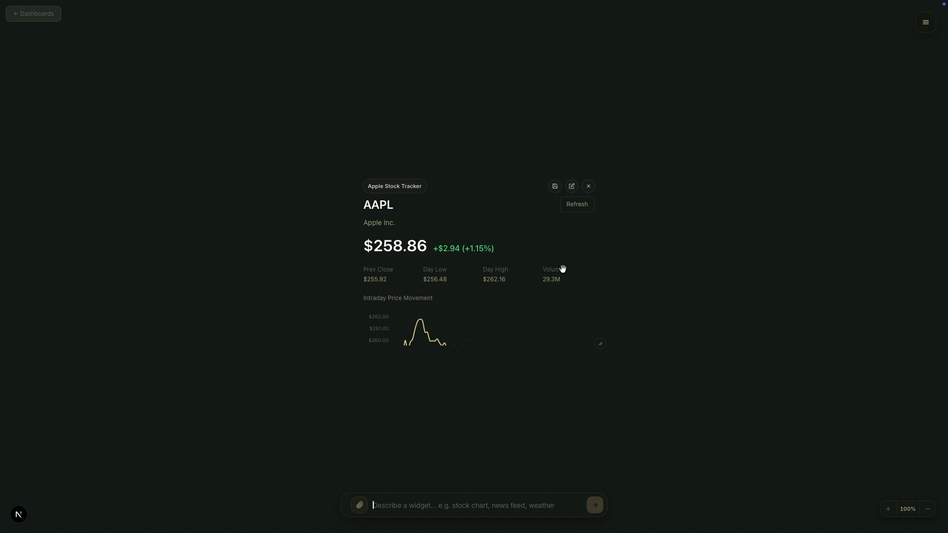 Describe what you need. Get a live, interactive dashboard, powered by AI that researches, builds, and updates in real time.
