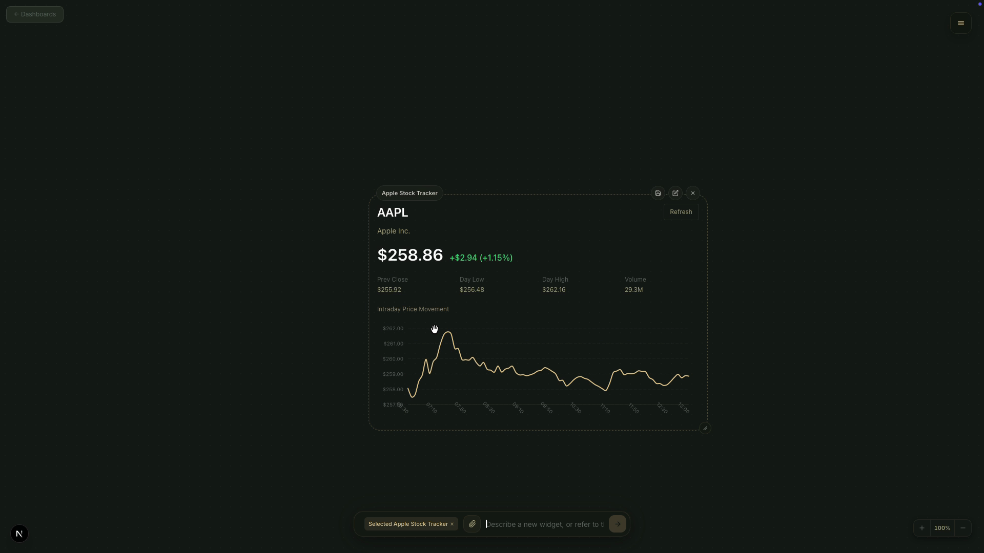 Connect to real-time data sources like markets, APIs, and databases. Your canvas always reflects what's happening now.